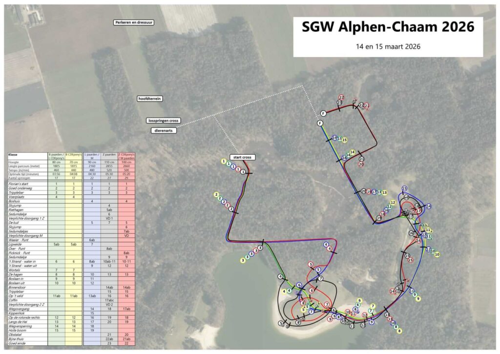 Het parcours voor beide wedstrijddagen kan verkend worden op vrijdag 13 maart vanaf 15.00 uur. Het secretariaat is aanwezig van 14.00 tot 17.00 uur (grote tent op het hoofdterrein). Houd voor de navigatie Boerenbaan 9 in Alphen aan, je vindt het parkeerterrein aan de linkerkant. NIET PARKEREN AAN DE FRANSE BAAN OF OP HET HOOFDTERREIN.